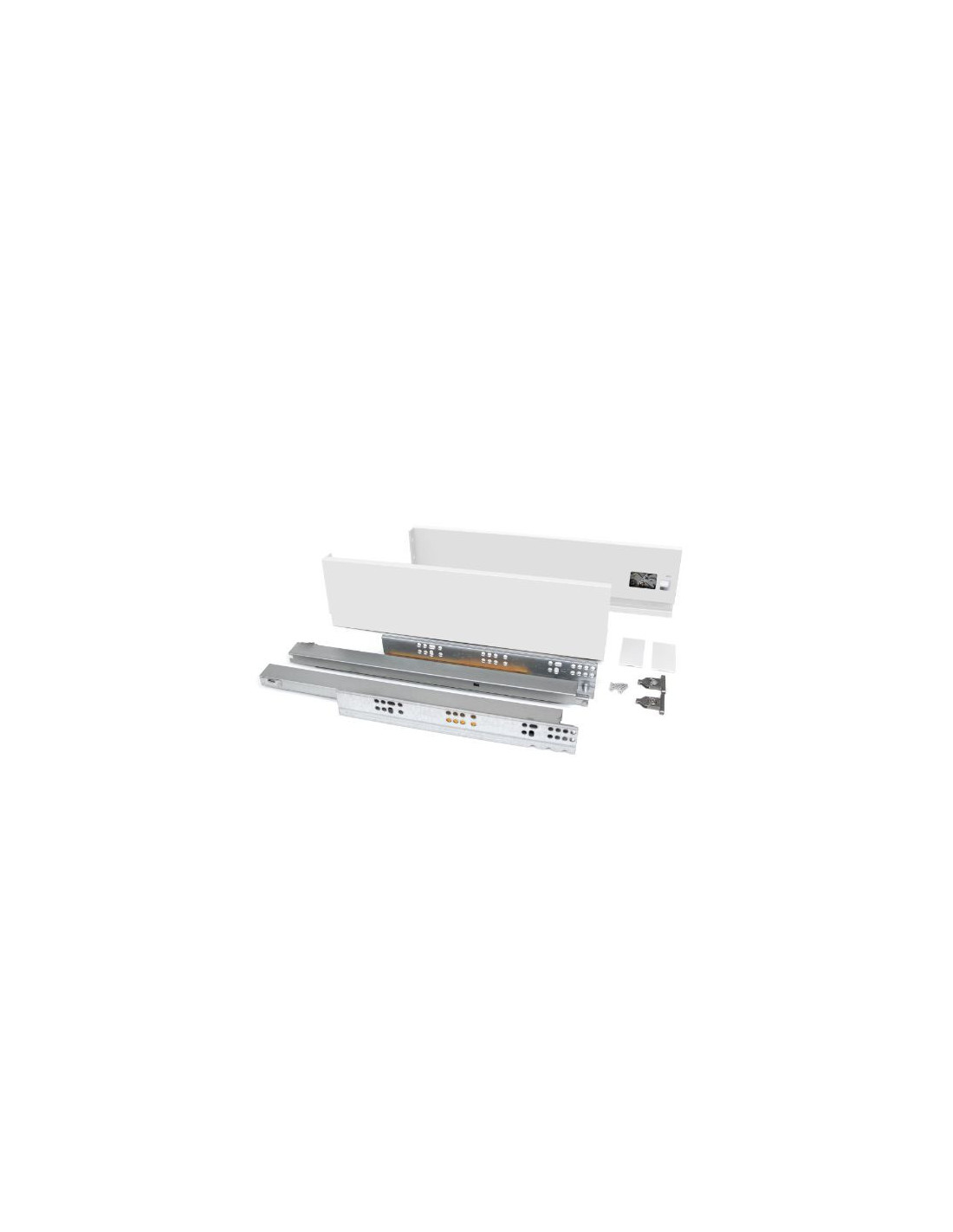 Kit de herrajes necesarios para el montaje de un cajón de altura 93 mm y profundidad 300 mm, a excepción de la frontera, trasera y fondo. Montaje en módulos con espesor de costado de 16 mm. Guías de extracción total sincronizada, con cierre amortiguado y capacidad de carga de 40 kg. Regulación de la posición del frente de cajón: ±2 mm en vertical y ±1 en horizontal. Fabricado en acero pintado color blanco.